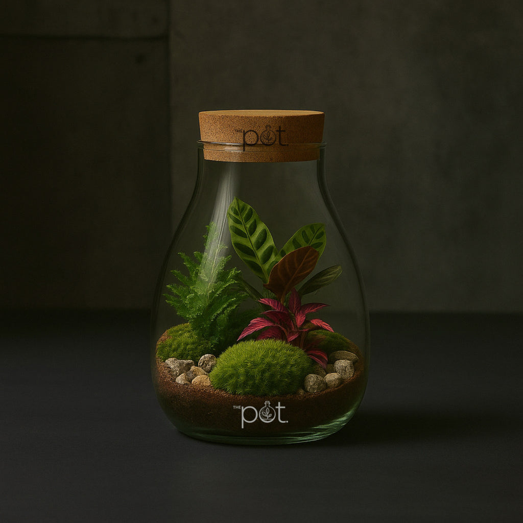 Περιλαμβάνει τροπικά φυτά, moss και φυσικά στοιχεία που δημιουργούν ένα ζωντανό τοπίο σε μικρή κλίμακα.