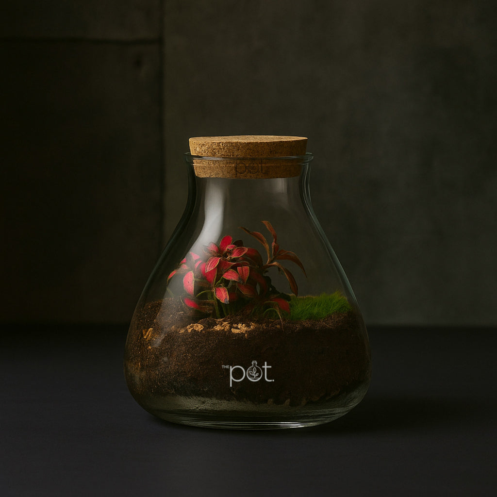 Περιλαμβάνει τροπικά φυτά, moss και φυσικά στοιχεία που δημιουργούν ένα ζωντανό τοπίο σε μικρή κλίμακα.