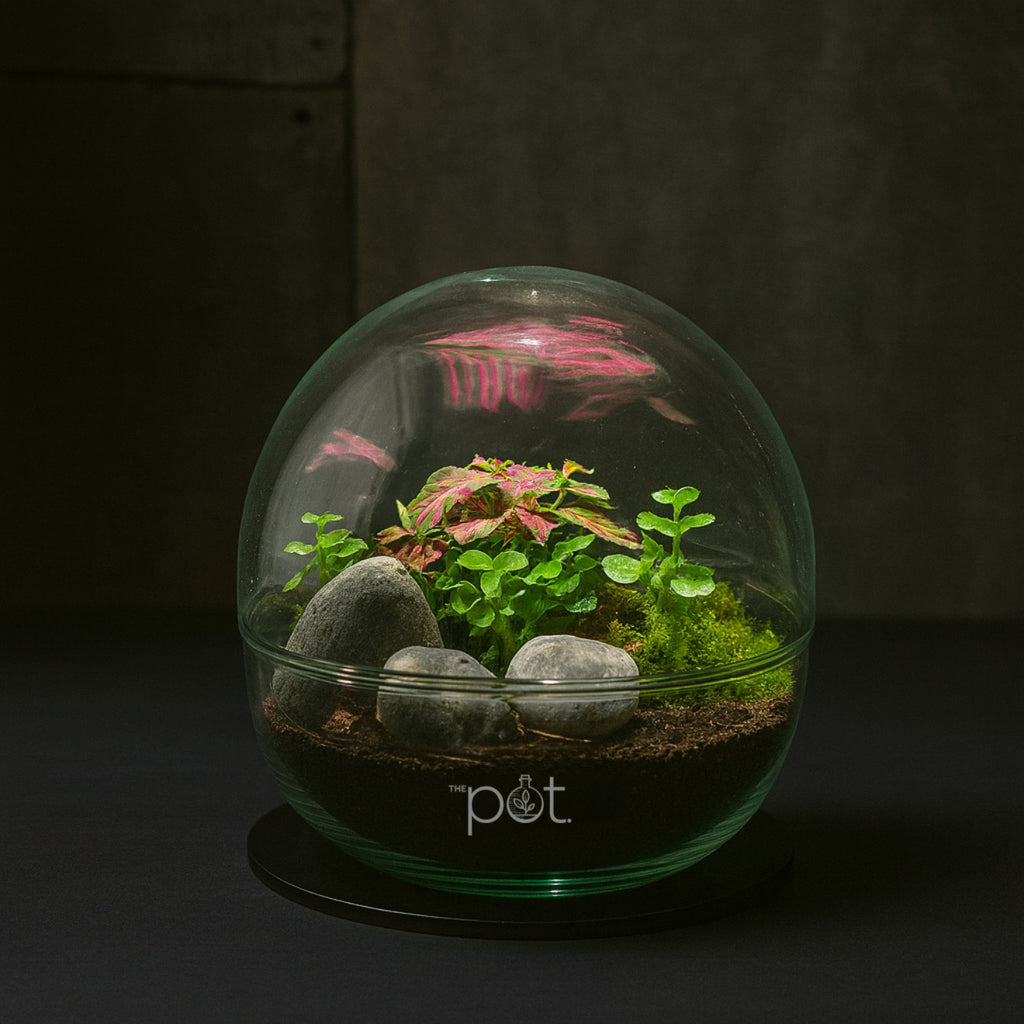 Περιλαμβάνει τροπικά φυτά, moss και φυσικά στοιχεία που δημιουργούν ένα ζωντανό τοπίο σε μικρή κλίμακα.