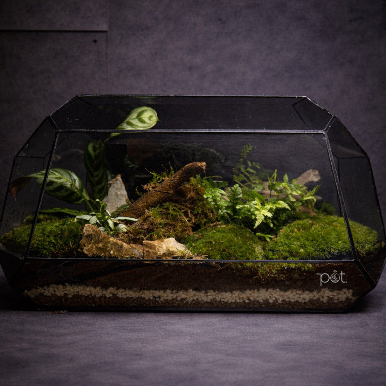 Χειροποίητη γυάλινη κατασκευή με τροπικά φυτά, moss και φυσικά στοιχεία.