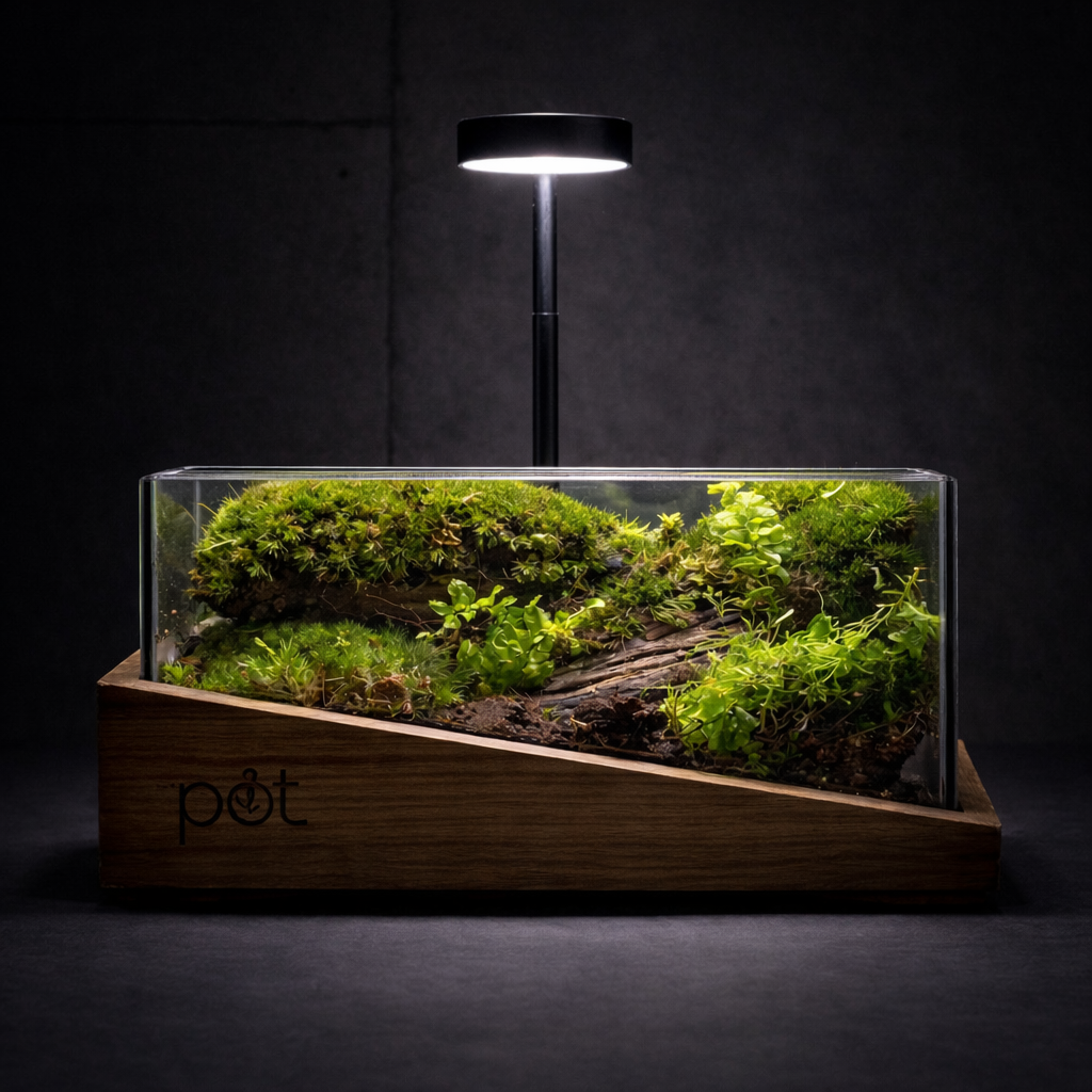Συνδυασμός φυσικού ξύλου και βρύων σε οριζόντια σύνθεση.